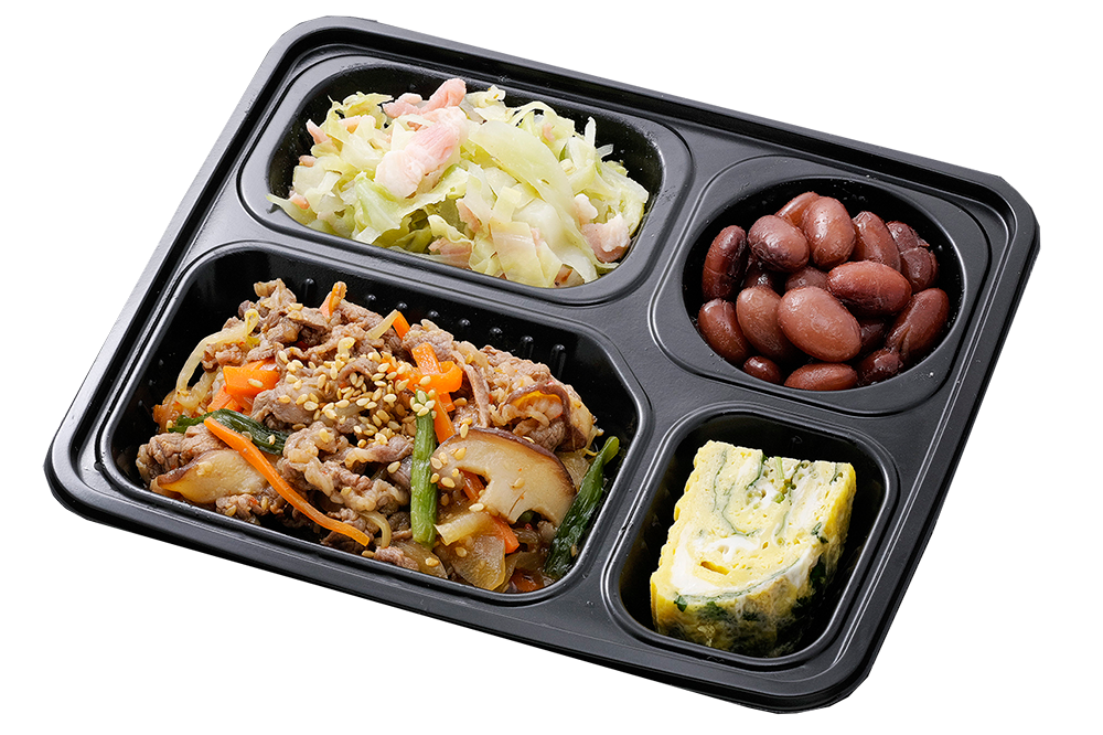 プルコギ、キャベツとベーコン白ワイン蒸し、うずら豆、三つ葉入りだし巻き卵