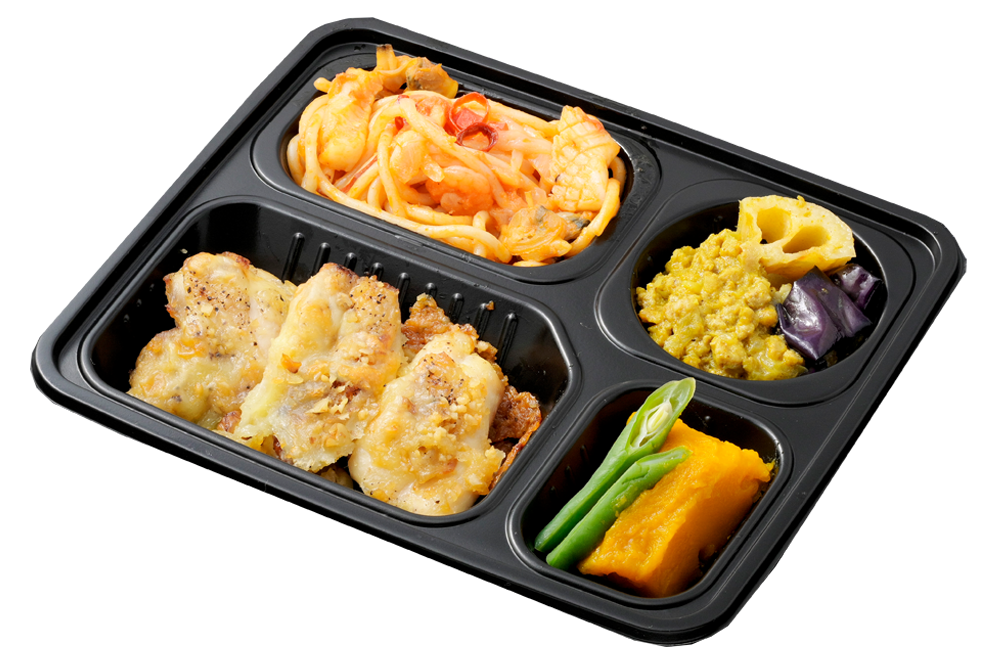 チキンチーズ焼き ナッツのせ、パスタ アラビアータ、茄子・蓮根・豚ひき肉カレー味、かぼちゃの煮物